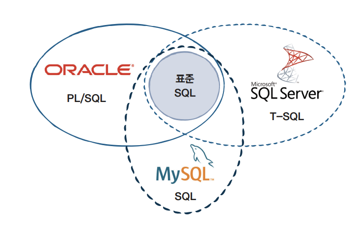 다음 그림을 보면 3가지 DBMS 제품(오라클, SQL 서버, MySQL)이 모두 표준 SQL을 포함하고 있습니다. 그래서 표준 SQL을 익히면 대부분의 DBMS에 공통적으로 적용할 수 있습니다. 각 DBMS는 추가로 자신만의 기능도 가지고 있어서 이렇게 변경된 SQL을 오라클은 PL/SQL, SQL서버는 T-SQL, MySQL은 SQL로 부릅니다.