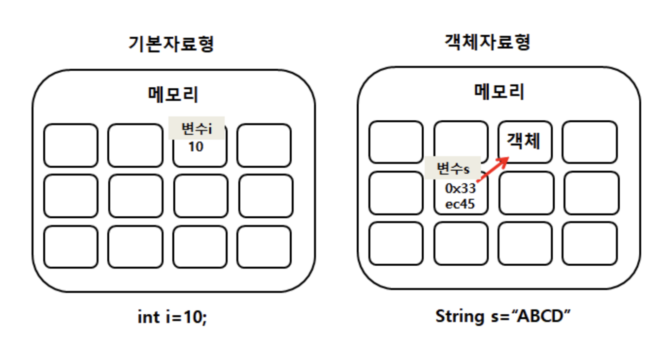 - 객체 자료형에는 "ABCD"는 다른 메모리공간에 넣어놓고 s에 잡힌 메모리 공간에는 ABCD를 넣어놓았던 그 메모리 공간의 주소가 담기게 됩니다.
