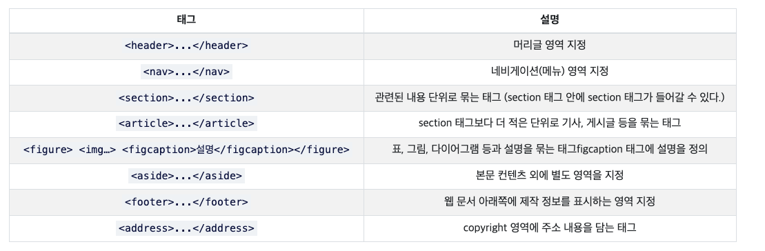- 웹페이지의 구조를 쉽게 이해할 수 있도록 정의된 태그
