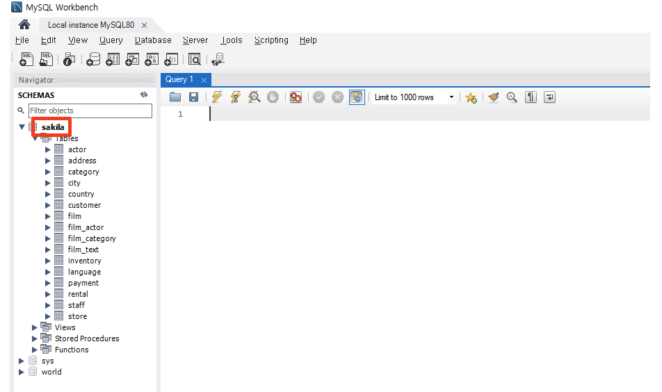 - 좌측 Navigator에 스키마가 정의 되어 있는데 그 중 sample DB인 sakila를 선택한다.(더블 클릭)