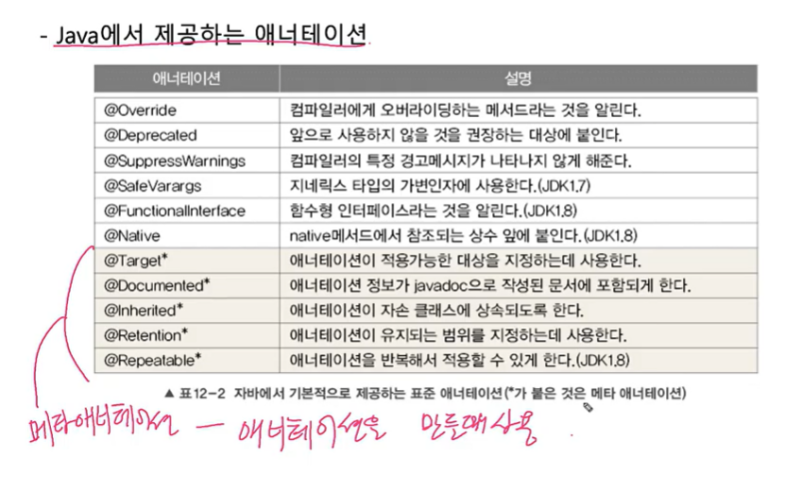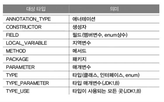@Inherited : 애너테이션이 자손 클래스에 상속되도록 한다. @Inherited가 붙은 애너테이션을 조상 클래스에 붙이면, 자손 클래스도 이 애너테이션을 붙은 것과 같이 인식된다.