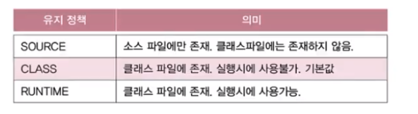 유지정책 class는 컴파일러가 애너테이션의 정보를 클래스 파일에 저장할 수 있게는 하지만, 클래스 파일이 JVM에 로딩될 때는 애너테이션의 정보가 무시되어 실행 시에 애너테이션에 대한 정보를 얻을 수 없다. 이것이 CLASS가 유지정책의 기본값임에도 불구하고 잘 사용되지 않는 이유다.