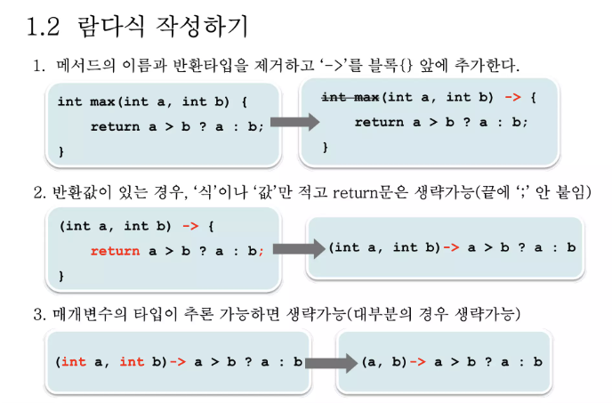 - 람다식은 메서드를 하나의 식으로 표현한 것이다.