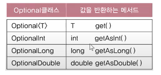 - 기본형 스트림의 최종 연산의 일부는 Optional 대신 기본형을 값으로 하는 OptionalInt, OptionalLong, OptionalDouble을 반환한다.