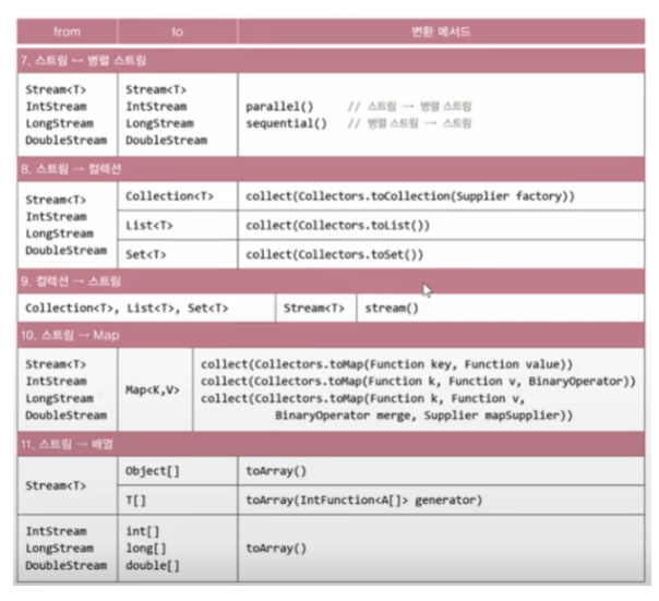 - 스트림에 저장된 요소들을 T[]타입의 배열로 변환하려면, toArray()를 사용하면 된다. 단, 해당 타입의 생성자 참조를 매개변수로 지정해줘야 한다.