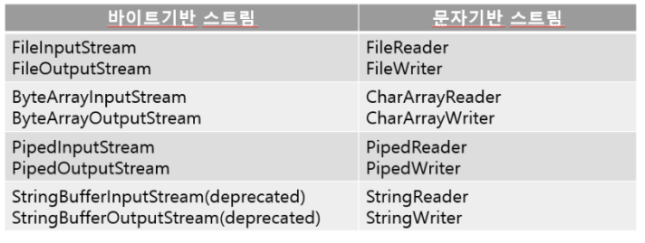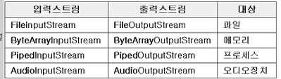 - 스트림은 바이트단위로 데이터를 전송하며 입출력 대상에 따라 다르다.
