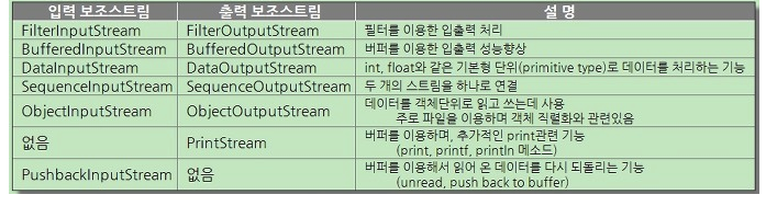 - 보조 스트림은 데이터를 입출력할 수 있는 기능은 없지만, 스트림의 기능을 향상시키거나 새로운 기능을 추가할 수 있다.