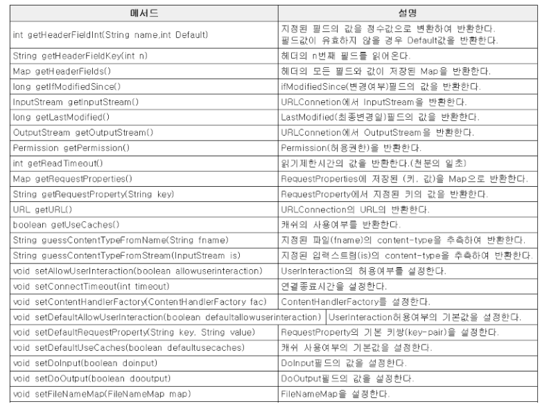 - URLConnection은 어플리케이션과 URL간의 통신연결을 나타내는 클래스의 최상위 클래스로 추상클래스이다.