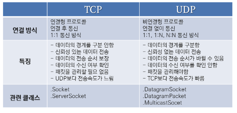- 자바에서는 java.net패키지를 통해 소켓 프로그래밍을 지원하는데, 소켓통신에 사용되는 프로토콜에 따른 다른 종류의 소켓을 구현하여 제공한다.