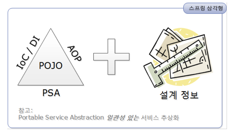 - POJP(Plain Old Java Object)를 기반으로 스프링 삼각형이라는 애칭을 가진 IoC/DI, AOP, PSA라고 하는 스프링의 3대 프로그래밍 모델.