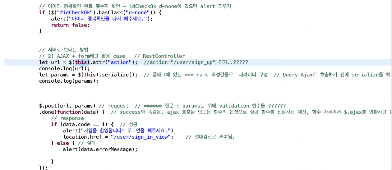 🌾 원인 : AJAX + form 태그 활용부분 - 버튼을 클릭하면 작동하는 함수에 this를 써서 속성을 변수에 정하려고 했다.