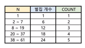 위의 그림과 같이 육각형으로 이루어진 벌집이 있다. 그림에서 보는 바와 같이 중앙의 방 1부터 시작해서 이웃하는 방에 돌아가면서 1씩 증가하는 번호를 주소로 매길 수 있다. 숫자 N이 주어졌을 때, 벌집의 중앙 1에서 N번 방까지 최소 개수의 방을 지나서 갈 때 몇 개의 방을 지나가는지(시작과 끝을 포함하여)를 계산하는 프로그램을 작성하시오. 예를 들면, 13까지는 3개, 58까지는 5개를 지난다.