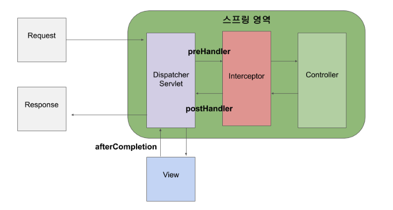 (핸들러 인터셉터를 등록하지 않았다면, 곧바로 컨트롤러가 실행된다. 반대로 하나이상의 인터셉터가 지정되어 있다면 지정된 순서에 따라서 인터셉터를 거쳐서 컨트롤러를 실행한다)
