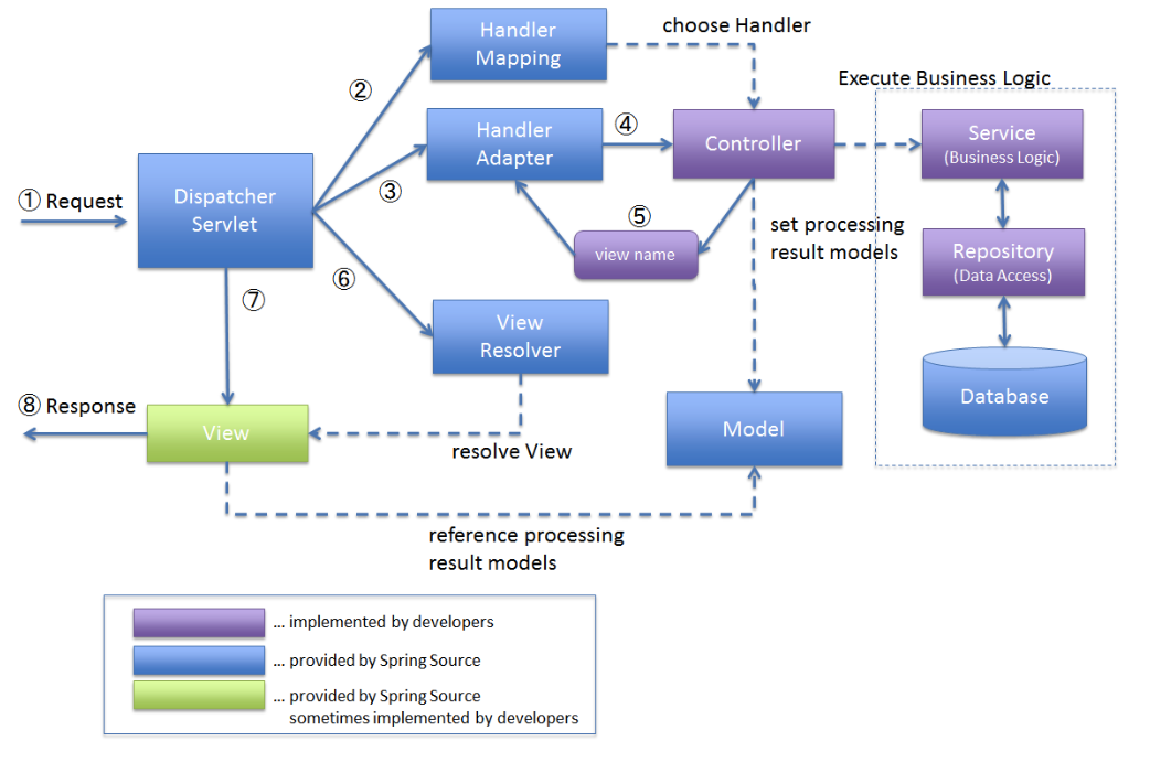 ※ 보다 정확하게 표현한다면, HandlerMapping은 DispatcherServlet로부터 전달된 URL을 바탕으로 HandlerAdapter 객체를 포함하는 HandlerExecutionChain 객체를 생성하며, 이후 DispatcherServlet이 HandlerExecutionChain 객체로부터 HandlerAdapter 객체를 가져와서 해당 메소드를 실행하게 된다.