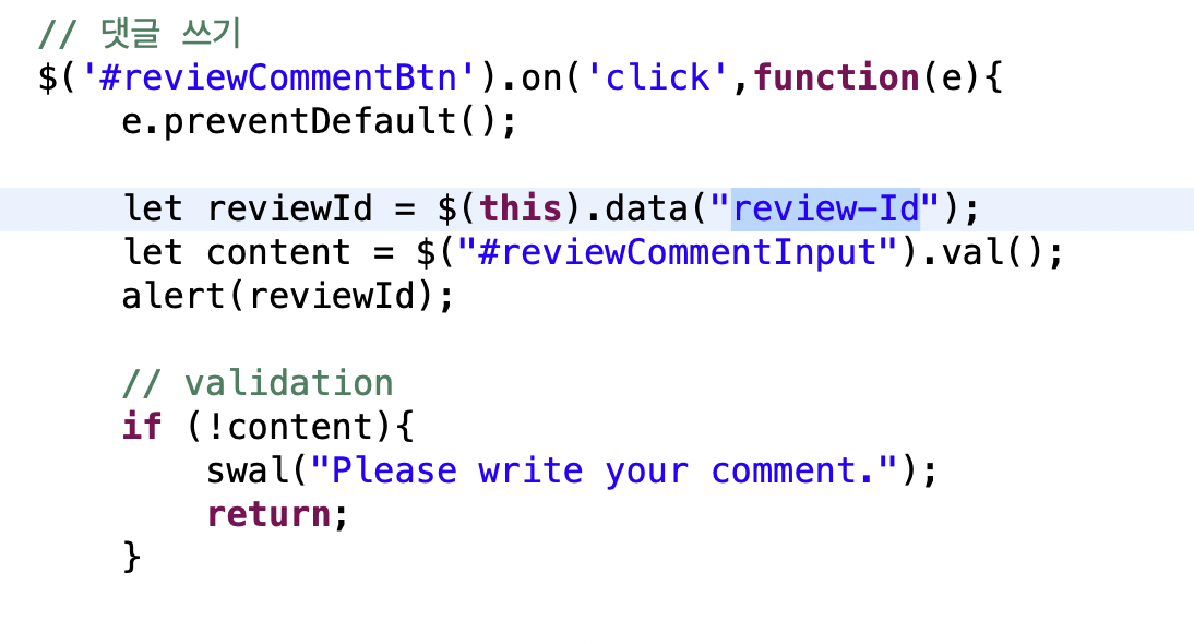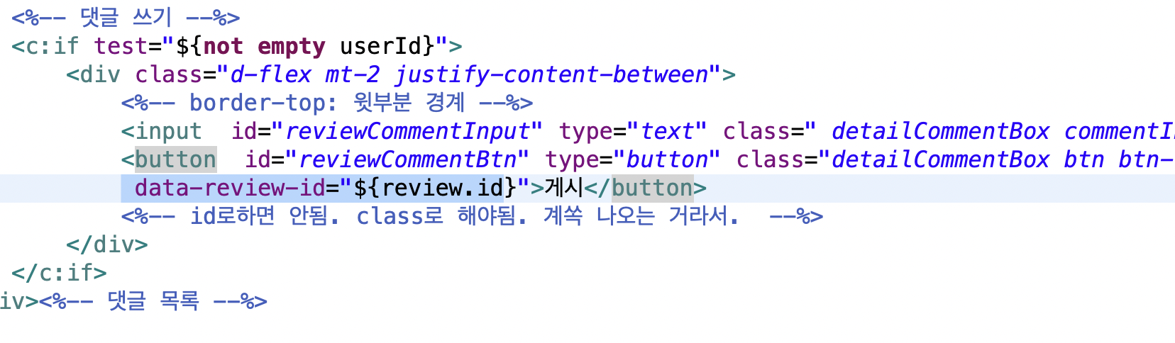 🌾 원인 : JSP에서 data로 review 아이디를 가져오는 과정에서 오타 발생.