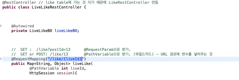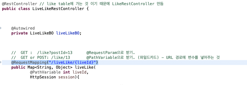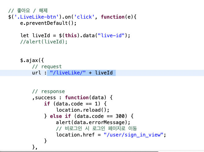 🌾 해결 방법 : JSP - request에서 보낸 url 주소와 @RequestMapping주소가 일치시키기. (/liveLike/)