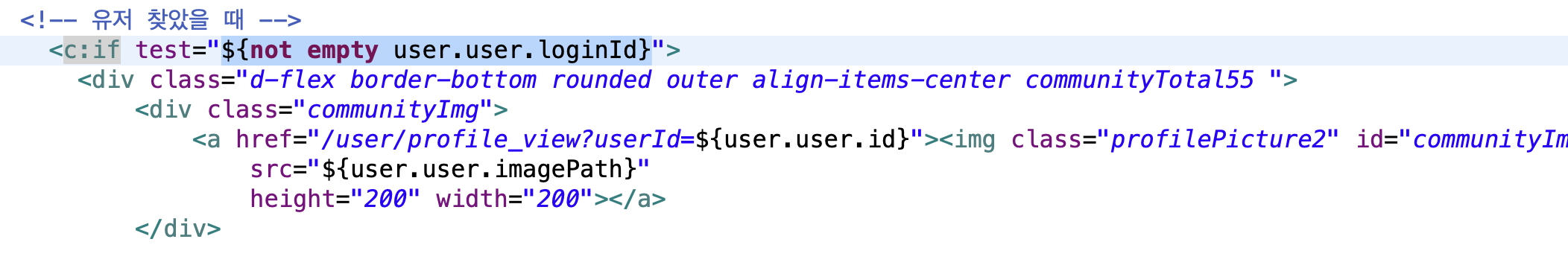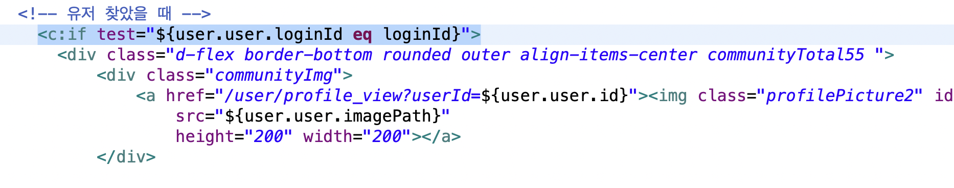 🌾 해결 방법 : 검색 기능 페이지 controller에서 검색된 아이디를 파라미터를 보내지 않고, 아래와 같이 jsp 문법 구문 수정.