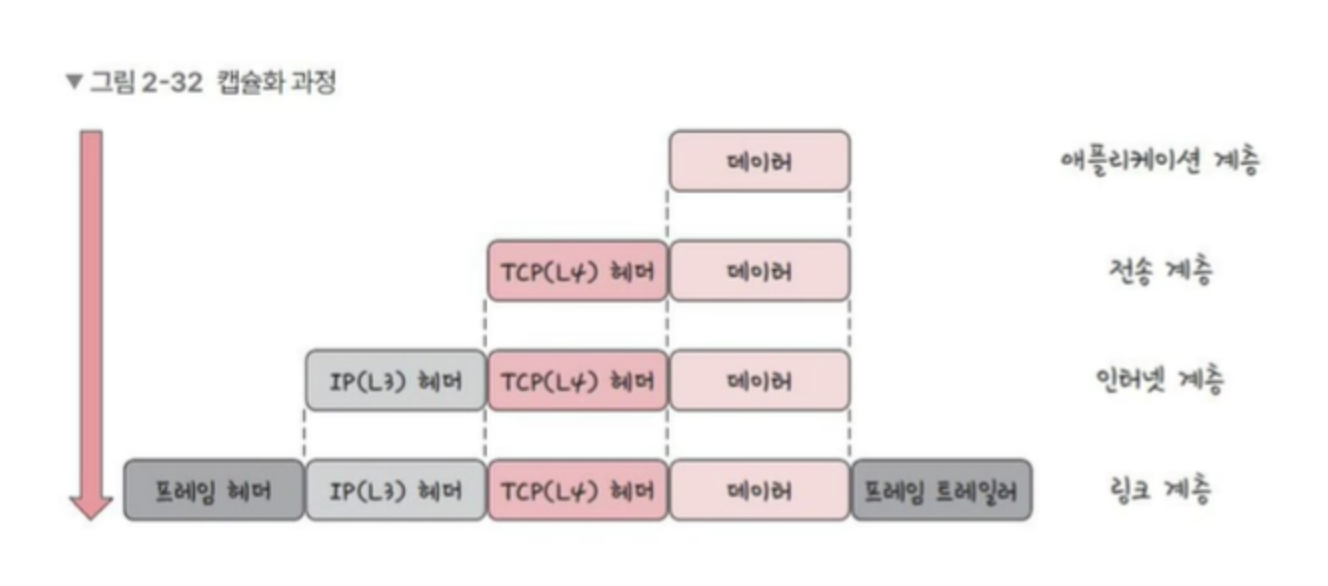- 캡슐화 과정은 상위 계층의 헤더와 데이터를 하위 계층의 데이터 부분에 포함시키고 해당 계층의 헤더를 삽입하는 과정을 말한다.