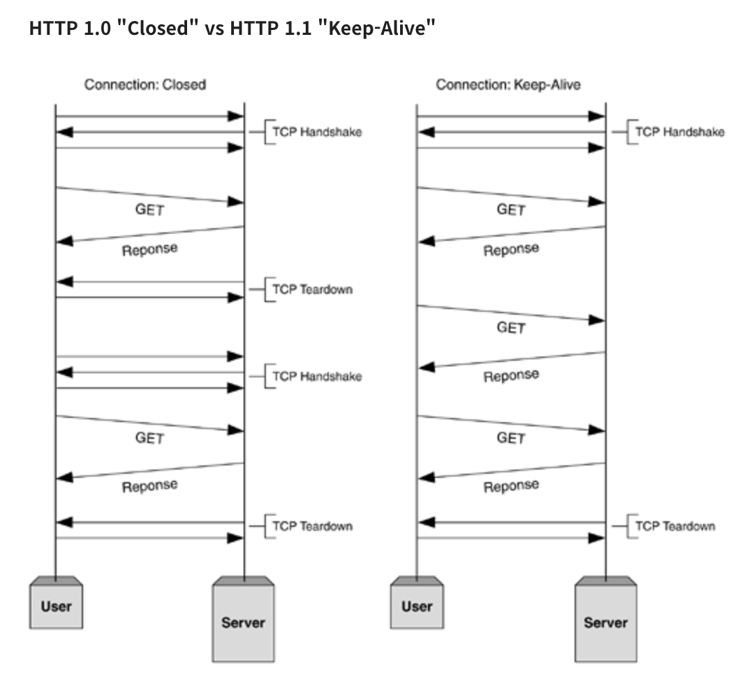 - HTTP/1.1 부터 keep-alive가 표준화가 되어 기본 옵션으로 설정되었다.