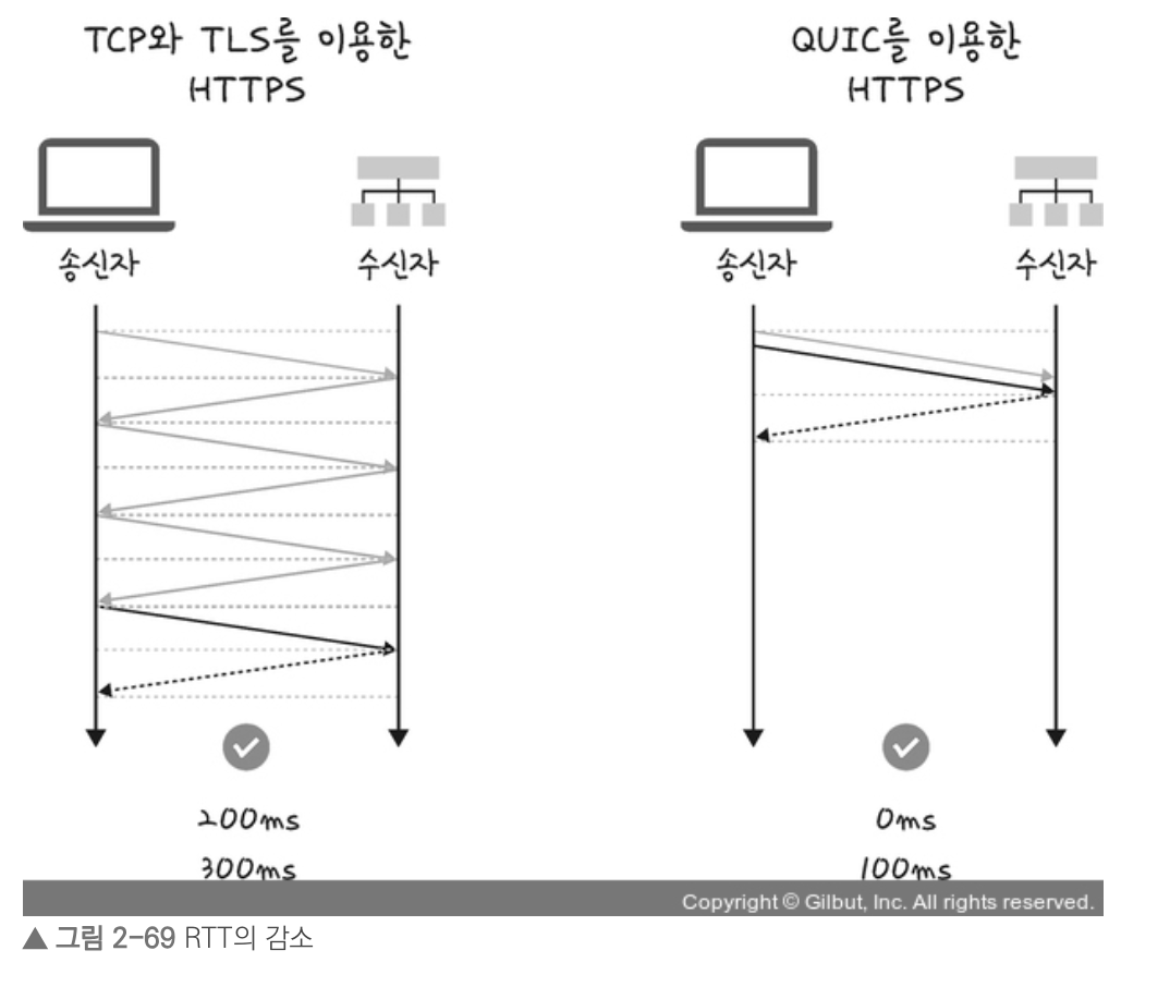 - QUIC은 첫 연결 설정에 1-RTT만 소요된다. 클라이언트가 서버에 어떤 신호를 한 번주고, 서버도 거기에 응답하기만 하면 바로 본 통신을 시작할 수 있다.
