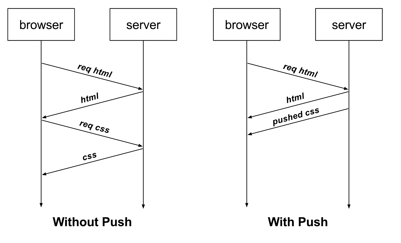 - 서버 푸시는 클라이언트 요청 없이 서버가 바로 리소스를 푸시 할 수 있는 것이다.