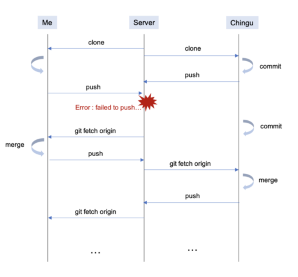 나(imacoolgirlyo)와 칭구(chingu)가 팀 프로젝트를 진행하기 위해서 github에 새로운 repository를 하나 만들었다. 각자 자신의 컴퓨터에 해당 저장소를 clone하여 작업한다. 변경 사항들을 commit 하고 chingu가 먼저 github remote 저장소에 push를 했다.