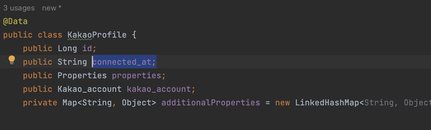 java.lang.RuntimeException: com.fasterxml.jackson.databind.exc.UnrecognizedPropertyException: Unrecognized field "connected_at" (class com.smartChart.patient.entity.KakaoProfile), not marked as ignorable (5 known properties: "kakaoAccount", "id", "connectedAt", "properties", "additionalProperties"])