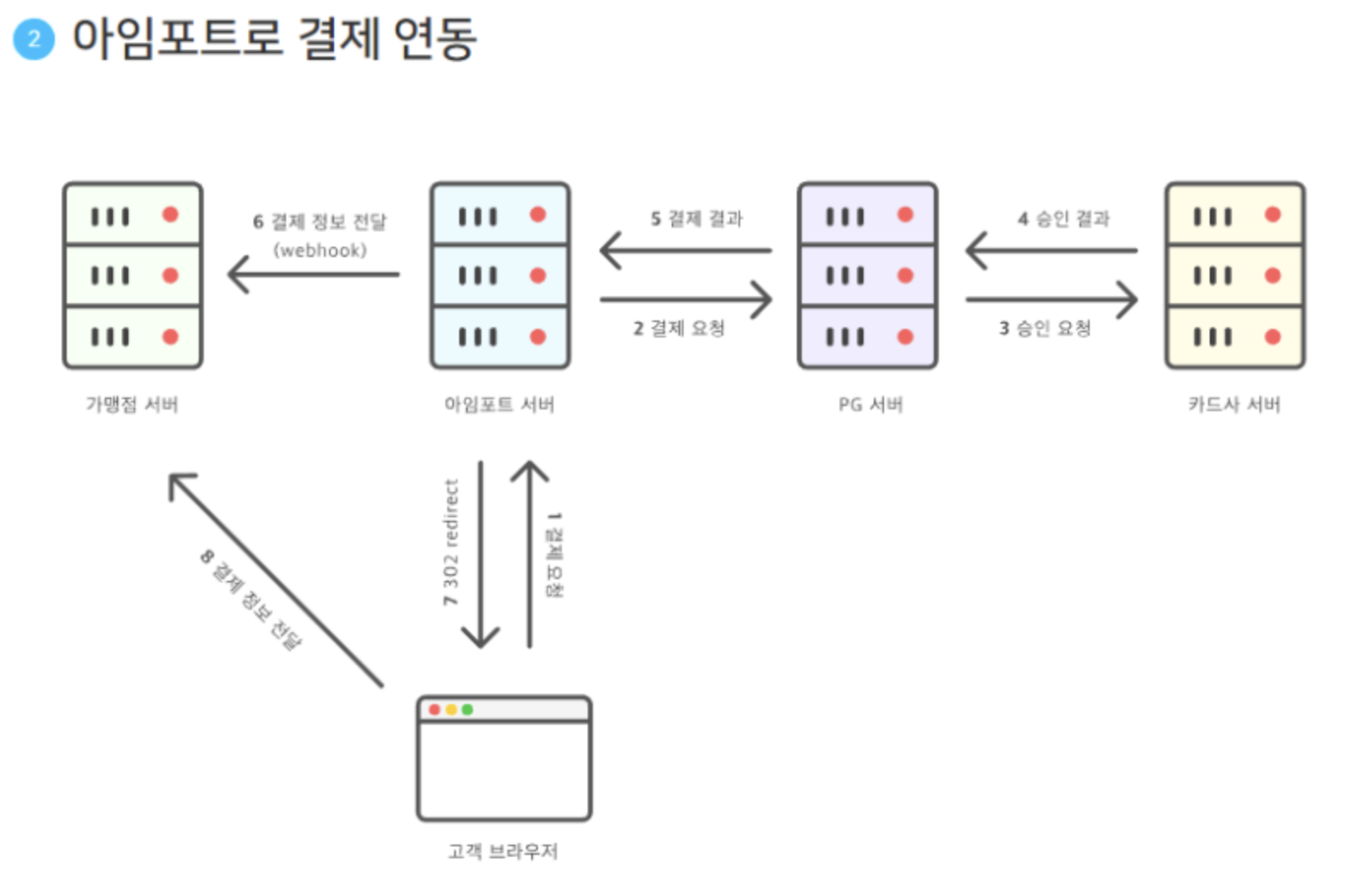 - 하지만 포트원을 사용하게 되면 이미 구현돼 있는 api를 통해 손쉽게 결제 요청,응답이 가능하게 됩니다. 다만 유저가 스크립트 조작을 통해 가격을 변동시켰을 때를 대비해서 "아임포트 서버에서 결제된 내역과 실제로 결제했을 때 출금된 정보 & 아임포트 서버에서 결제된 내역과 내DB에서 물건가격 정보" 2가지를 비교해줘야 한다는 점이 있습니다.