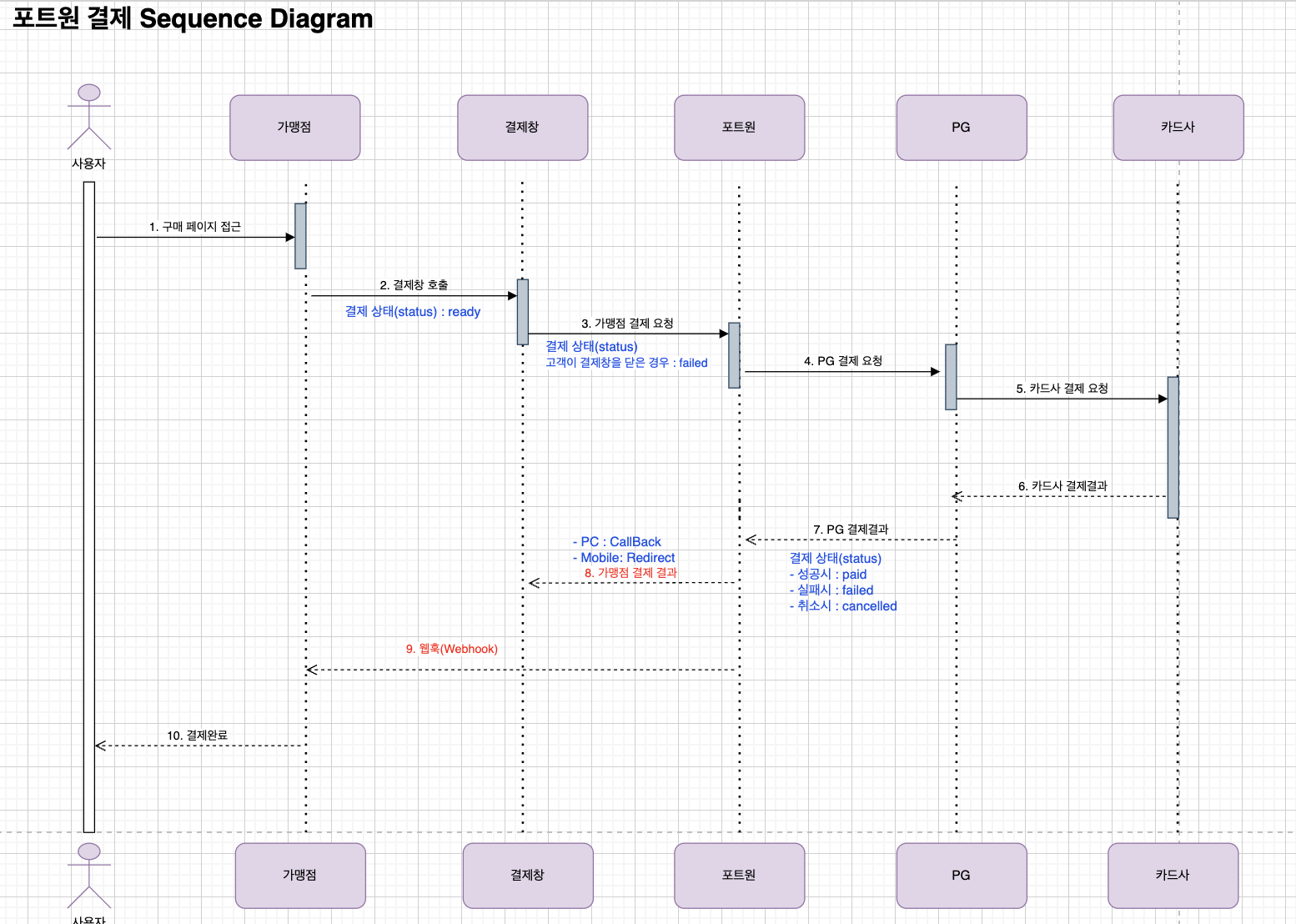 - 포트원 결제 시스템을 사용할 때 시퀀스 다이어그램을 정리해봤습니다.
