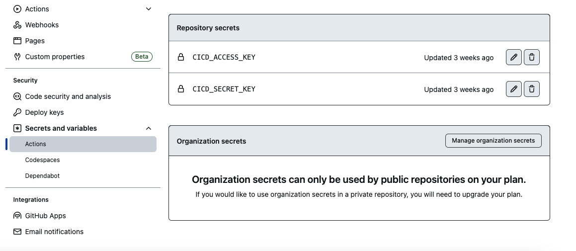 Repository Secret에 IAM 사용자 액세스 키 ID와 비밀 액세스 키를 저장합니다.