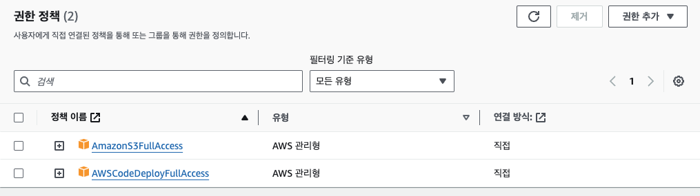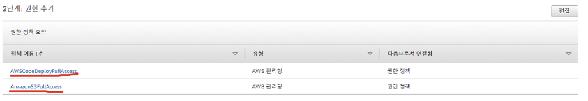 S3FullAccess, CodeDeployFullAccess 를 선택하여 해당 서비스에 대한 모든 권한을 부여합니다.