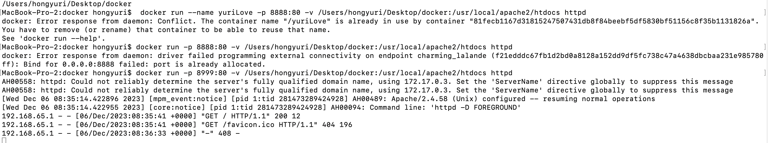 $ docker run -p 8999:80 -v /Users/hongyuri/Desktop/docker:/usr/local/apache2/htdocs httpd